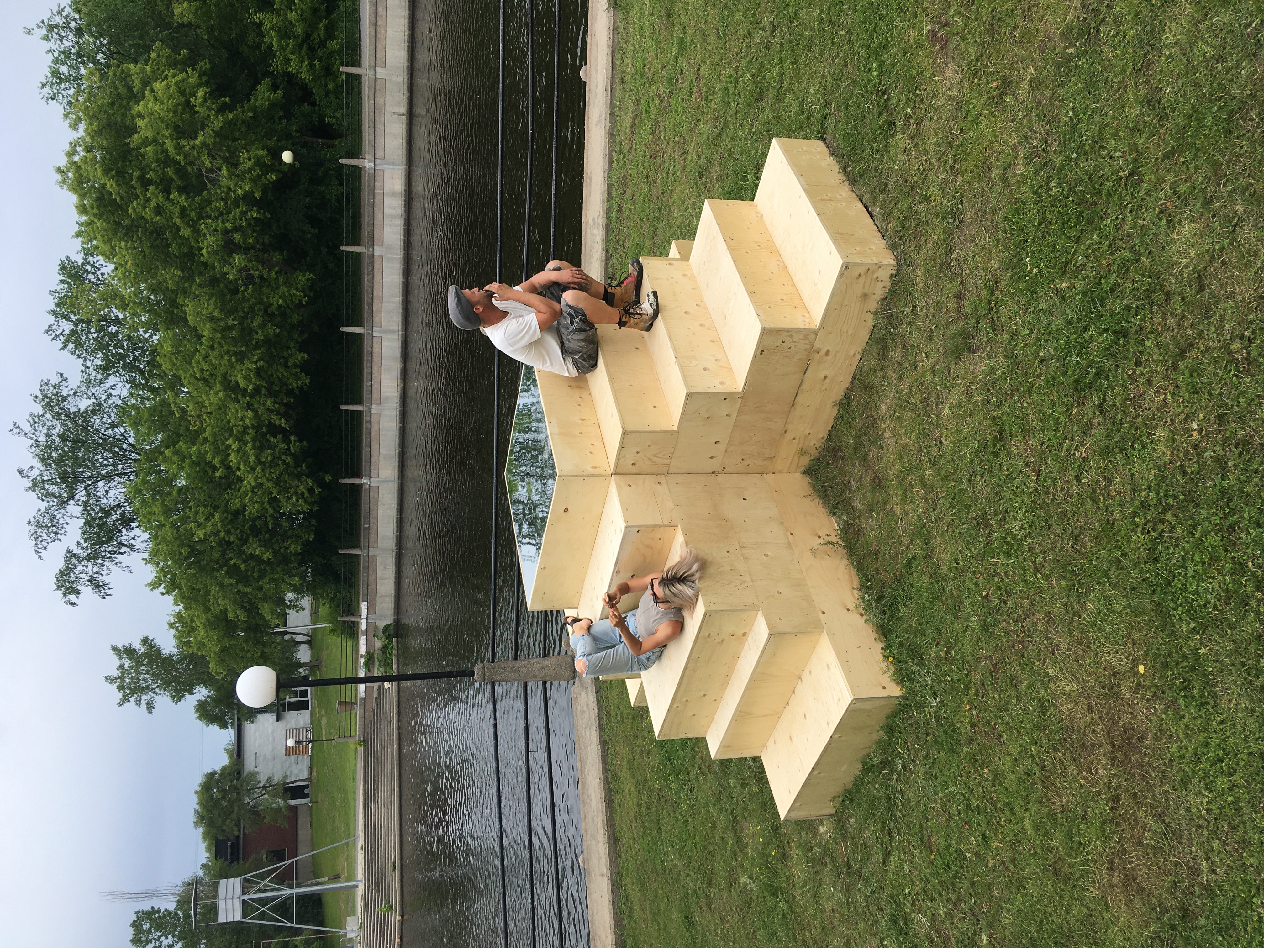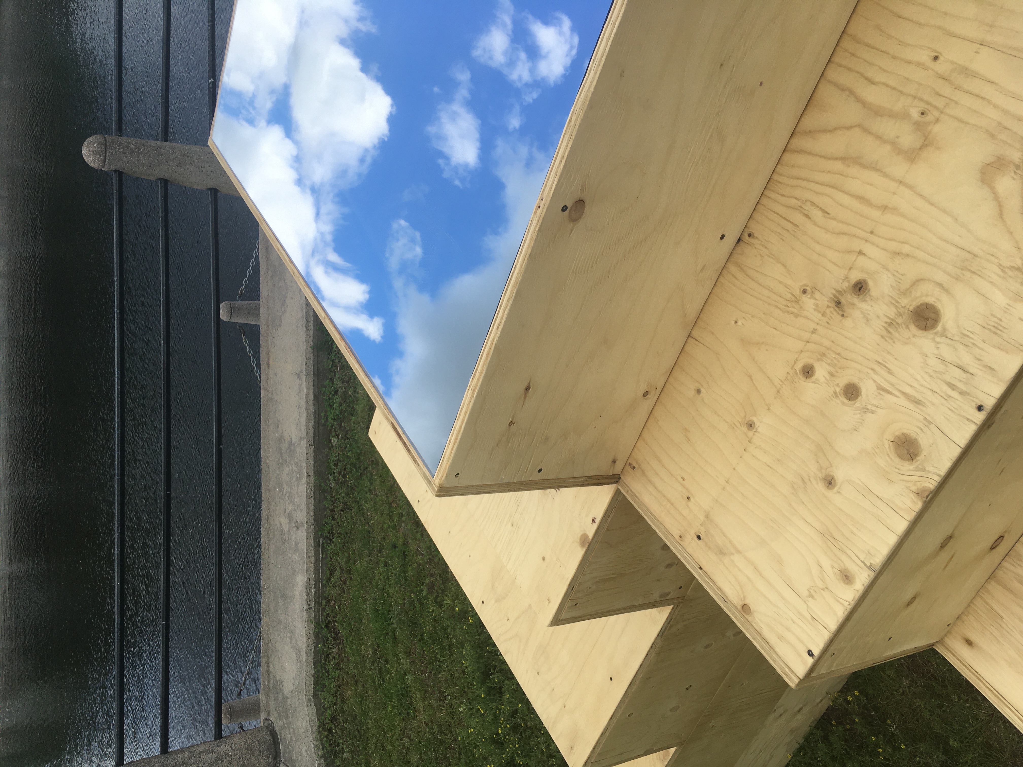 Socle (sans titres) fait écho aux pratiques récentes de déboulonnage des statues tout en témoignant du besoin collectif de se retrouver après la période d'isolement que nous avons traversée. En retravaillant la figure de l'escalier, un élément architectural du quotidien, la structure construit un lieu de représentation à la fois neutre et indéterminé, égalitaire, mais irrégulier. L'installation-sculpture interroge la fonction esthétique et politique de l'objet-piédestal en appelant le public à prendre place. Le socle, vacant, devient ici le support d'une réflexion du ciel, du site environnant ou des personnes qui seraient tentées de le gravir. Comment aménager un espace où les idéaux viennent à manquer, où les idéologies se confrontent? Sur quelle base devrions-nous nous retrouver?